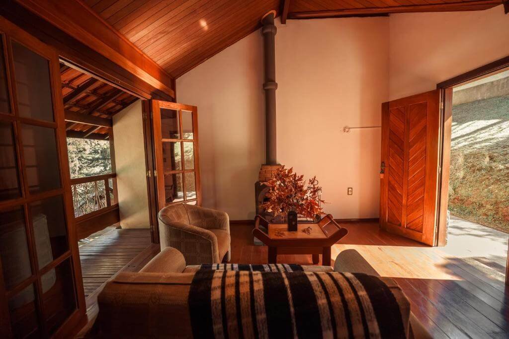 A pousada oferece encantadores chalés, equipados com sala de lareira, lençol térmico, aquecedor e uma bela vista para o bosque. Não é incomum que os adoráveis animais da região da Mantiqueira façam uma visita, trazendo encanto adicional aos hóspedes.